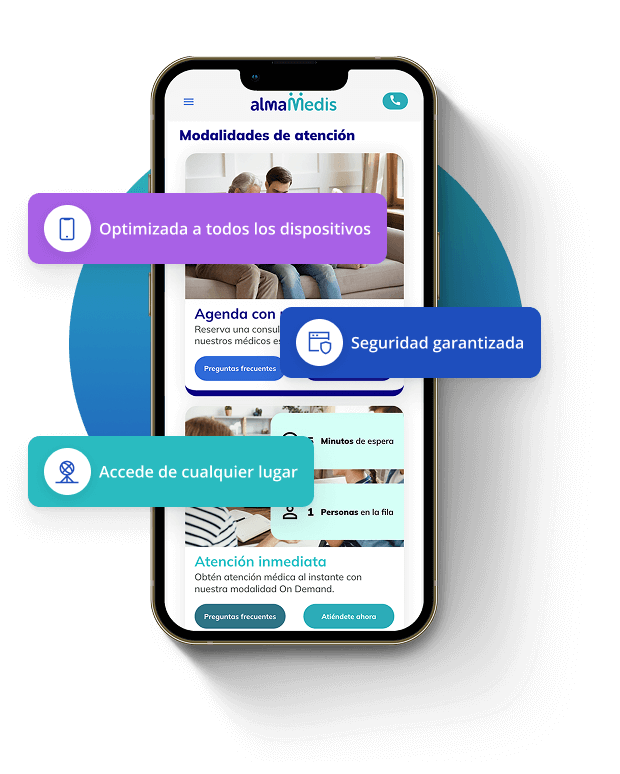 Desde donde estés, accede a una consulta de calidad, con un profesional y sin esperas. ¡Así de fácil es cuidarte con AlmaMedis!